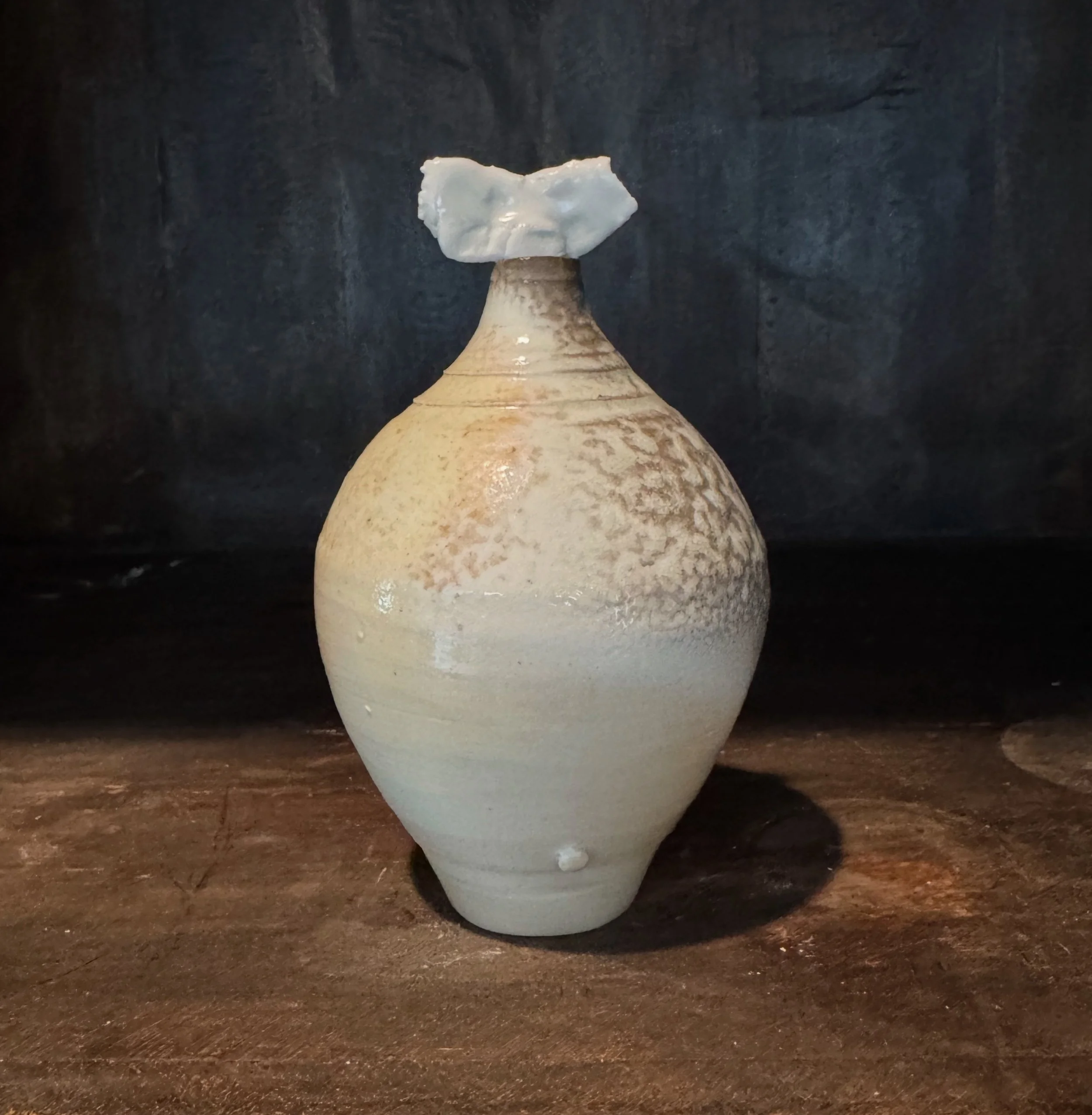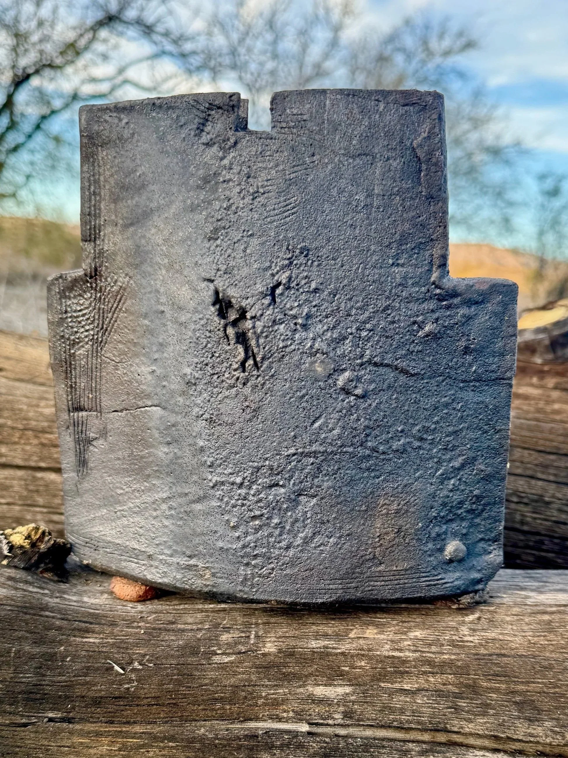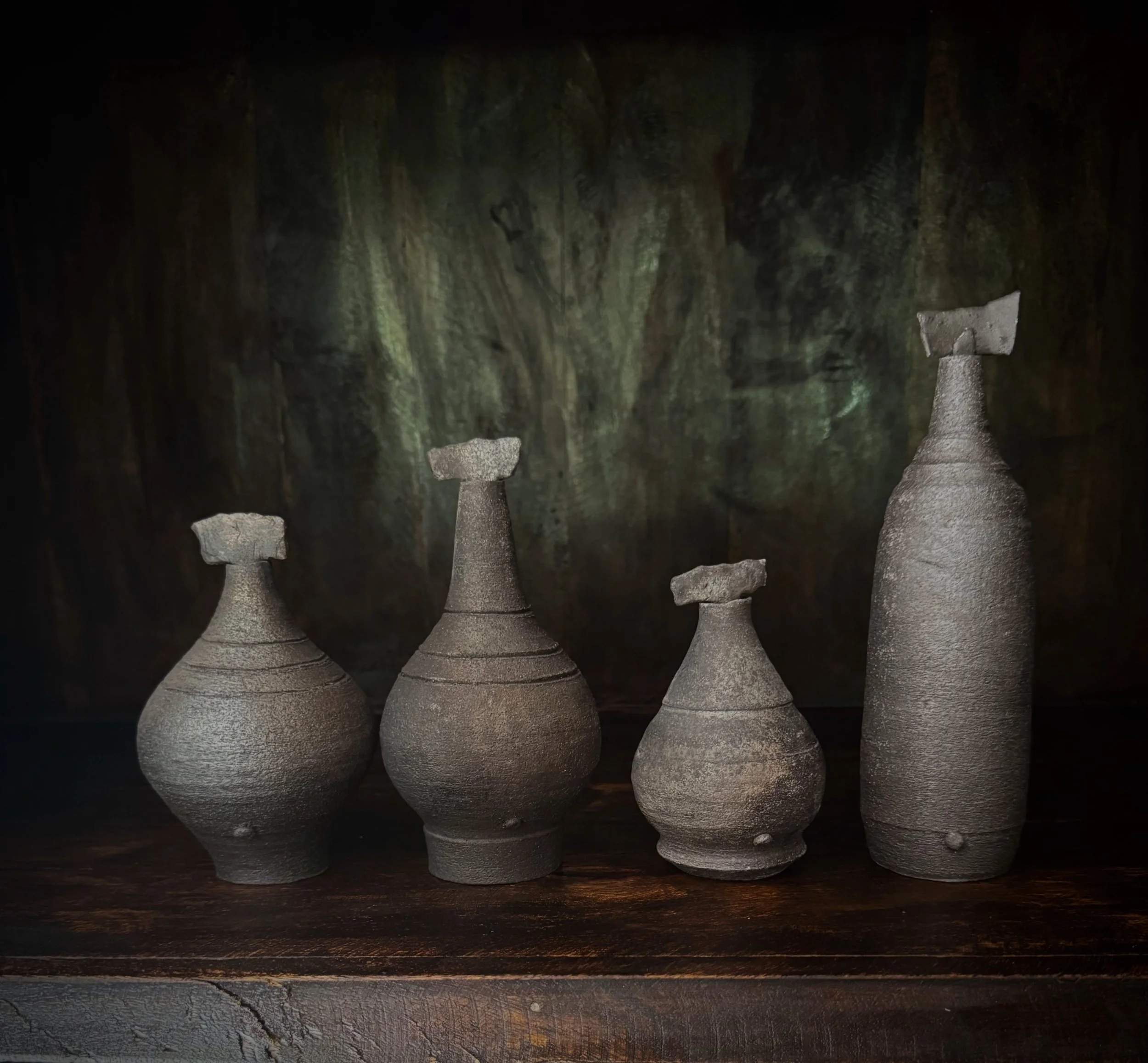 My style is “Fred Flintstone Meets the Dalai Lama”… kind of ancient and raw with a spiritual undercurrent. I like to create simple vessels for sacred offerings, bottles for essences and oils, and expressions of divinely feminine galactic ancestors. I primarily work in black clay and porcelain. I often keep work unglazed and wood fired, allowing the natural forces within the kiln to provide their own surface rhythms and alchemy. I recently finished another spectacular wood firing and I’ll upload images of them here very shortly.