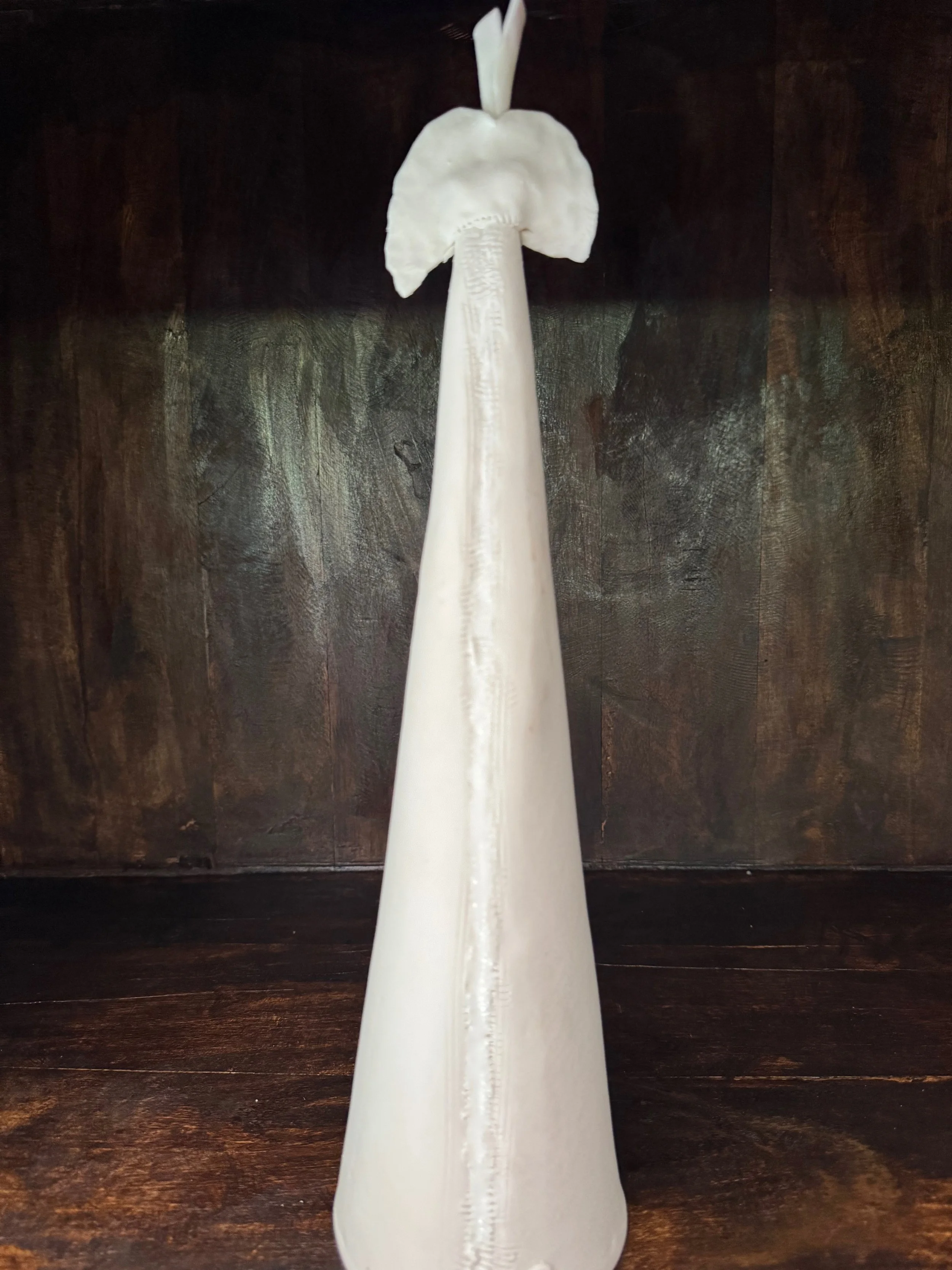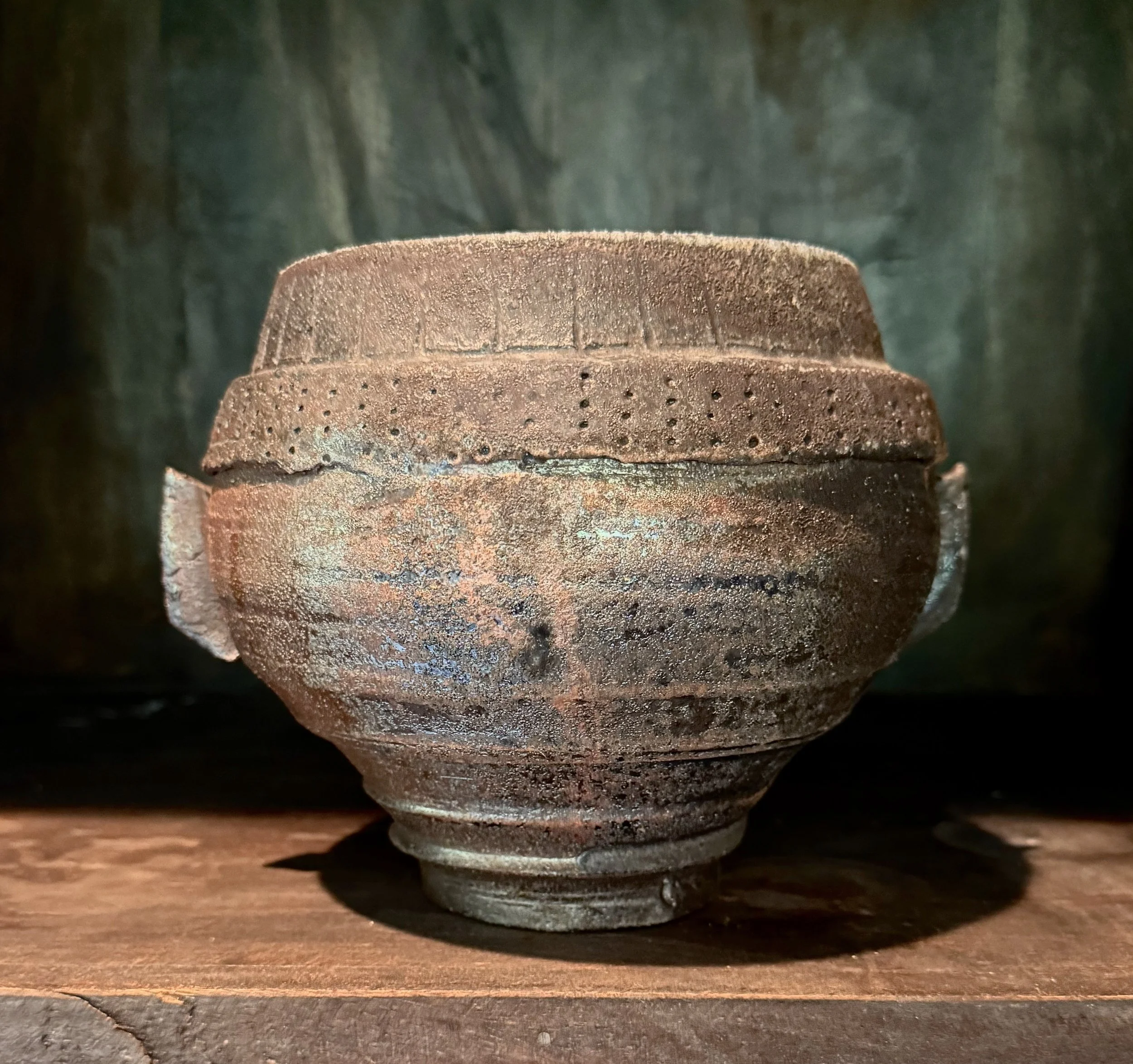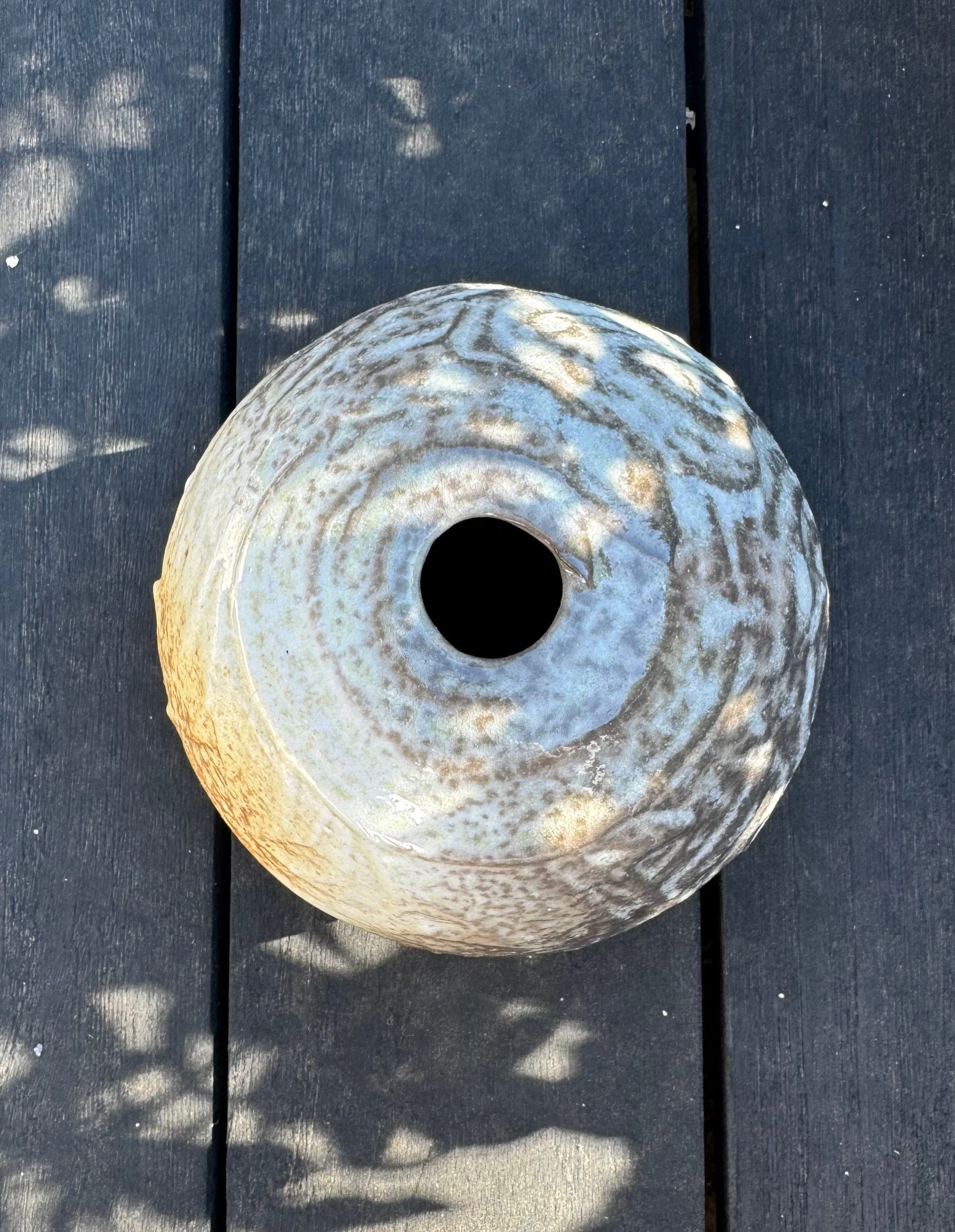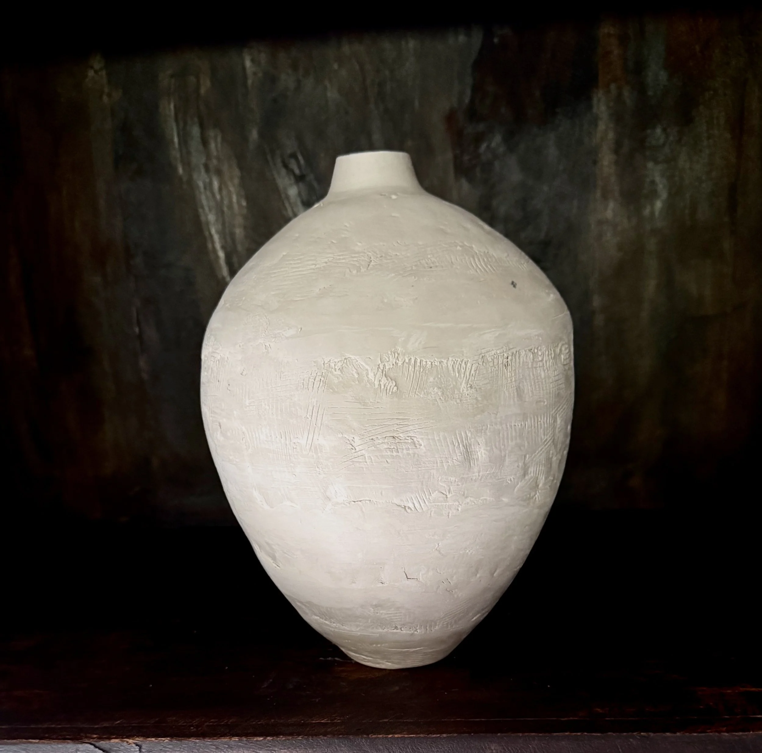 My style is “Fred Flintstone Meets the Dalai Lama”… kind of ancient and raw with a spiritual undercurrent. I like to create simple vessels for sacred offerings, bottles for essences and oils, and expressions of divinely feminine galactic ancestors. I primarily work in black clay and porcelain. I often keep work unglazed and wood fired, allowing the natural forces within the kiln to provide their own surface rhythms and alchemy. I recently finished another spectacular wood firing and I’ll upload images of them here very shortly.
